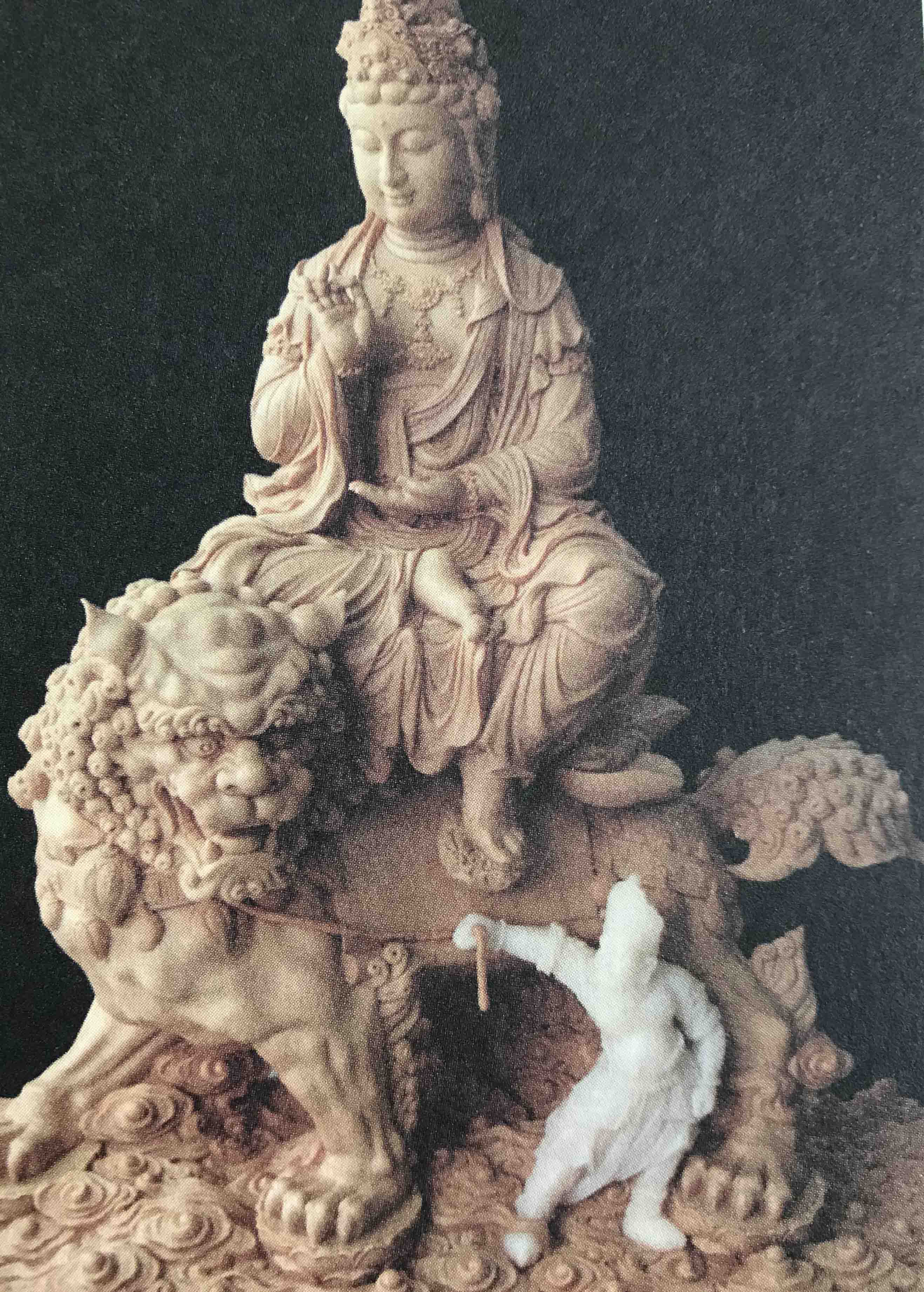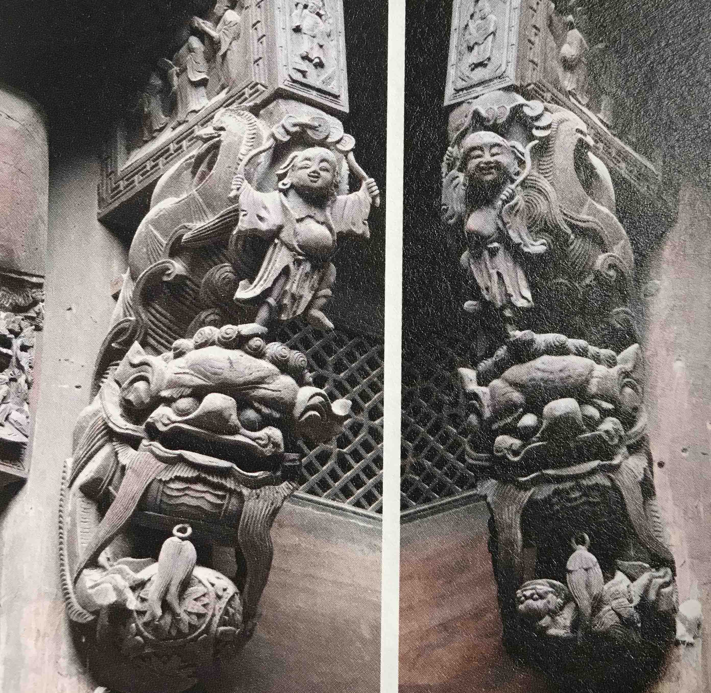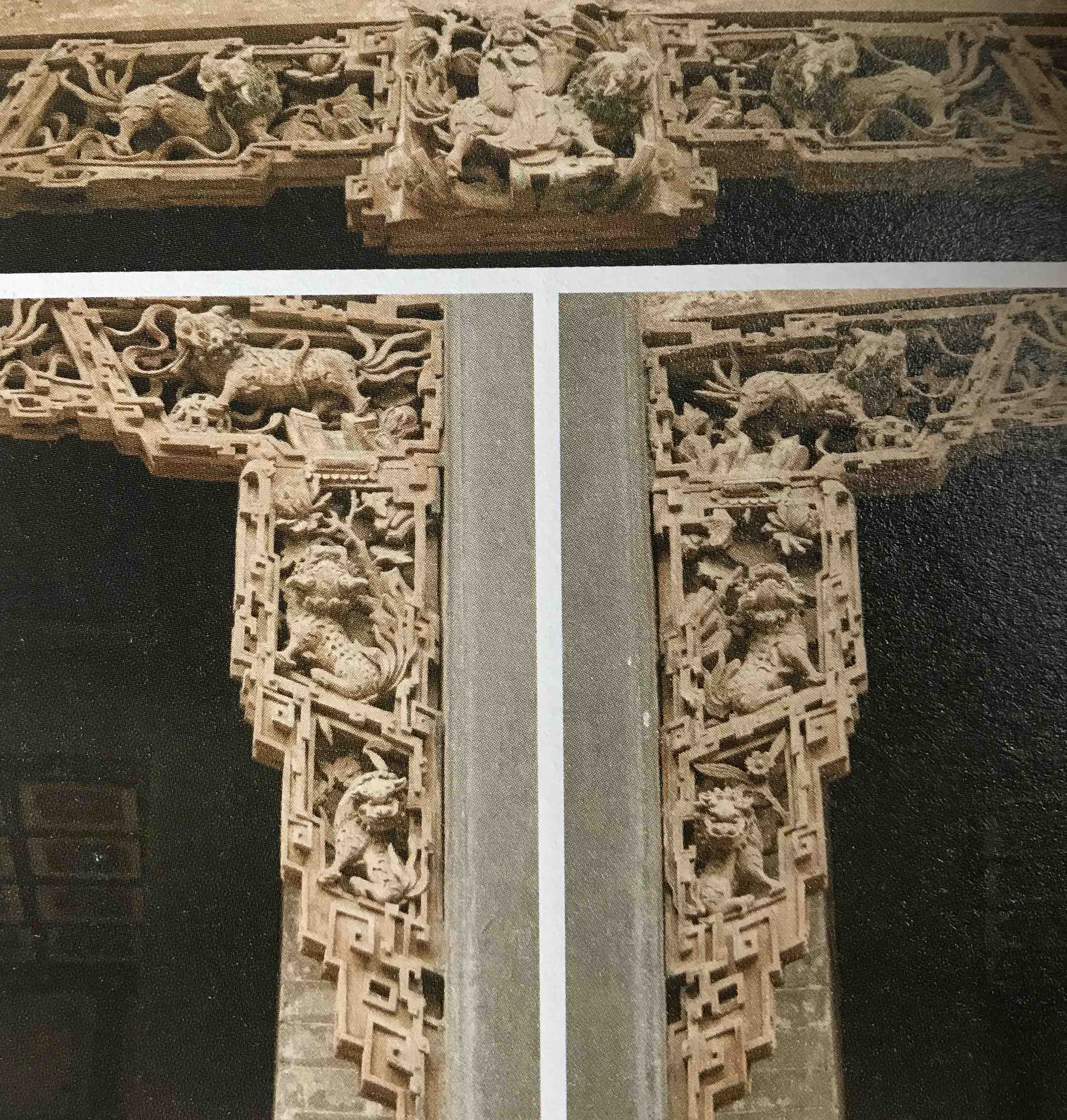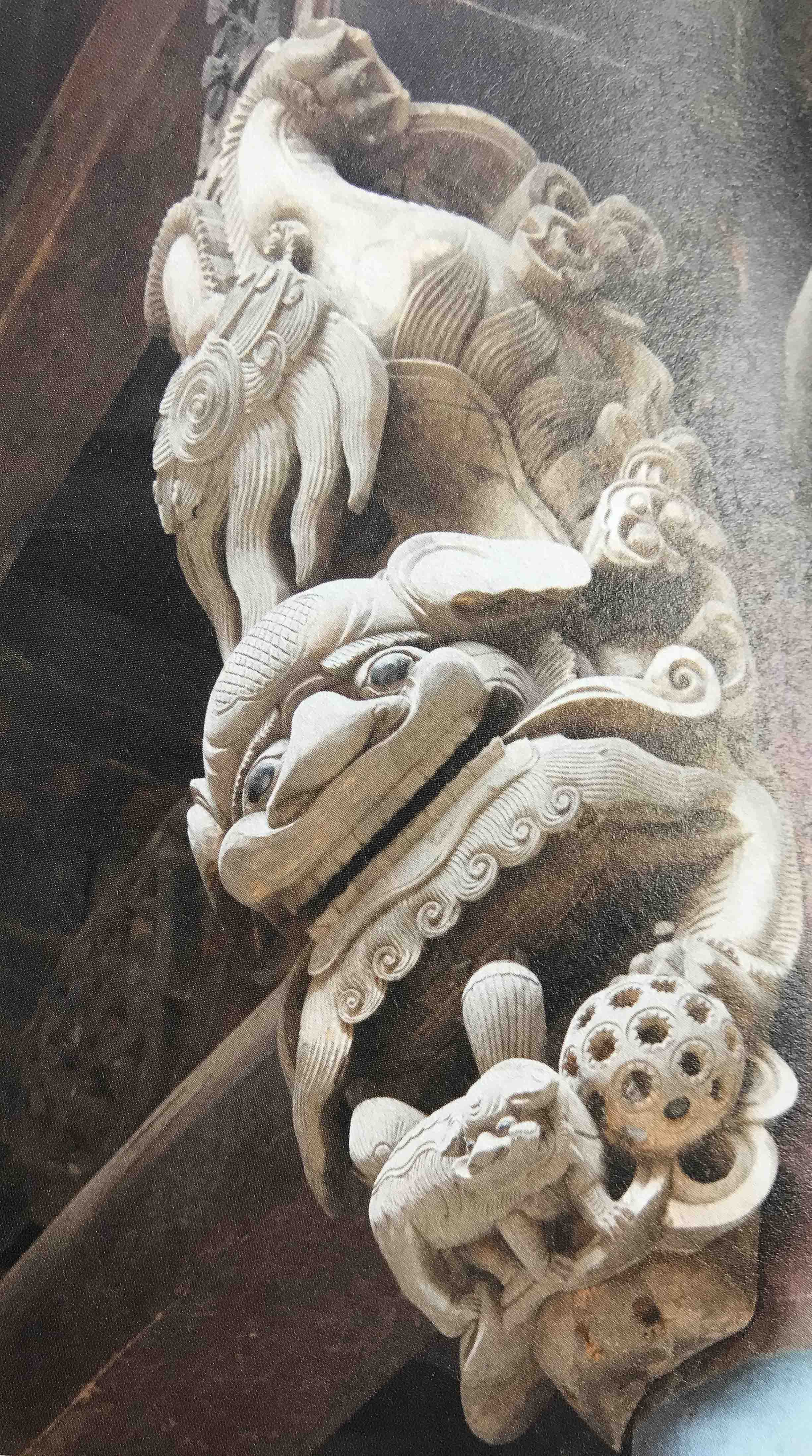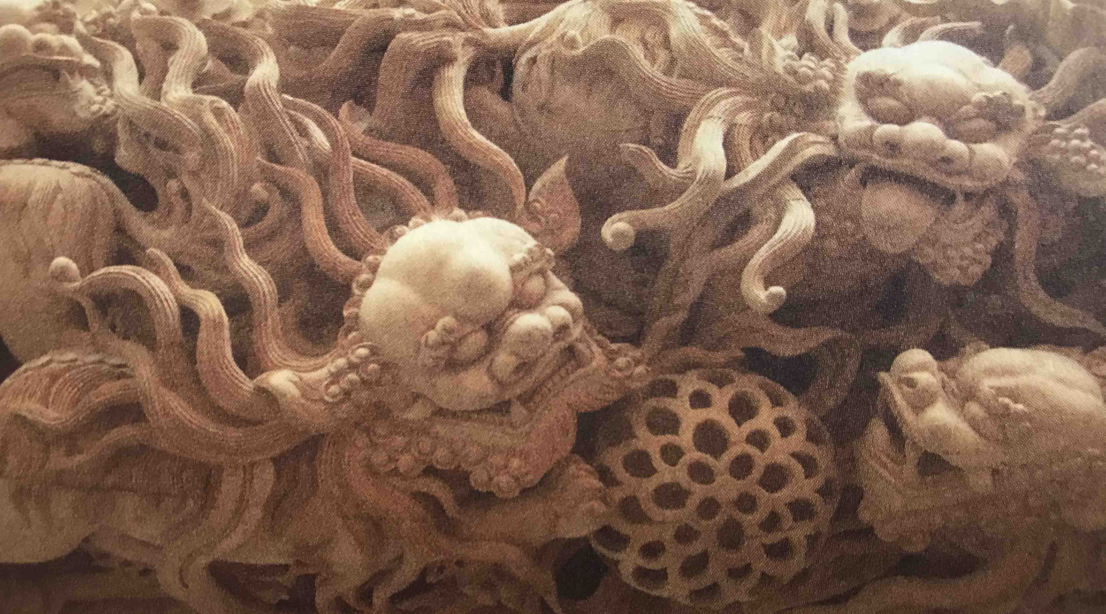 狮子向建筑领域发展,宫殿、寺塔、宅第、桥梁等,处处可见已经走向世俗化的狮子形象。在建筑材料上,屋顶部分的狮子走进北京紫禁城,宫殿殿堂的一片屋顶上都覆盖着黄色的琉璃瓦作为装饰。其中的狮子当然仍旧是勇猛、威武的象征。凡是重要的建筑,例如举行封建朝廷重要礼仪活动的太和殿和保和殿的屋顶上,都用九只小兽;在比较次要的殿堂,如中和殿、交泰殿的屋顶上,用七只小兽,将排列在后面的獬豸、斗牛去掉,只留前面的七只;在更为次要的建筑,如御花园中的楼阁、亭子上,则用五只或三只小兽;到一些墙门的屋顶上,则只保留当头的一种小兽了。屋顶兽按建筑的重要性分别用五、七、九只进行装饰这就是展现在建筑上的等级制。值得注意的是,位居第三的狮子在紫禁城的多数殿堂的屋顶上都有它的位置。狮子不仅出现在宫殿建筑的屋顶上,同时也出现在一些民间建筑的屋顶上。广东东莞茶山镇南社村是一座古老的血缘村落,在这座谢氏家族聚居的村落中,至今还保存着十几座大大小小的祠堂。在几座祠堂大门前没有守门的狮子,但抬头一望,狮子却出现在屋顶上。和宫殿建筑一样,这些狮子也是固定在屋顶垂脊的前端,它们蹲立在屋脊上,歪着脑袋,瞪着双眼,张着嘴,口中还衔着带有花球的彩带,注目凝视着前方。在一座百岁祠堂的屋顶上,小狮子分别蹲立在垂脊、戗脊和山墙脊的前端,左右共有六只之多。这些小狮子由陶和琉璃烧制而成,色彩绚丽,从姿态到神态都比大门前的石狮子活泼。它们不但守护着建筑,同时也起到美化建筑的作用。牌楼的守门狮,它们或蹲在抱鼓石上,或趴伏在夹杆石上,起着护卫牌楼的作用。现在要介绍的是在牌楼上部的狮子。石牌楼的结构很简单,地上立柱,柱子之间用横向的枋联系,顶上或用屋顶,或不用屋顶。各地比较多见的是四柱开间的牌楼,立柱之间用一道或者多道横枋相联,工匠多在这些横枋上雕刻出狮子滚绣球的场景。两只狮子左右相对,中间滚动着一个绣球,有的在绣球上还趴伏着一只幼狮,组成群狮耍绣球的场景。值得注意的是,不论是标志性的或者纪念性的牌楼,也不论是表彰为朝廷效力的功臣,还是对家庭尽孝守节的孝子、节妇,这些牌楼上雕的都是狮子滚绣球的题材。狮子作为勇猛、威武的象征,再加上有吉祥意义的绣球,已经具有了普遍性的意义。在各地的寺庙,祠堂或者讲究的住宅多喜欢用牌楼式的大门以增加建筑的气势。这类牌楼并非独立存在,仅仅是贴附在大门四周墙上的一层装饰,多为砖或灰塑制成。在这些牌楼门上也可以见到狮子的踪影,它们或出现在中央开间的门枋上或者出现在一对枋柱之间的雀替上,或在伸出柱子的枋木头上。狮身下还有两只正在嬉戏的幼狮,脑袋上顶着如意纹,具有守护大门和吉祥的象征意义。(中国龙)(龙纹)