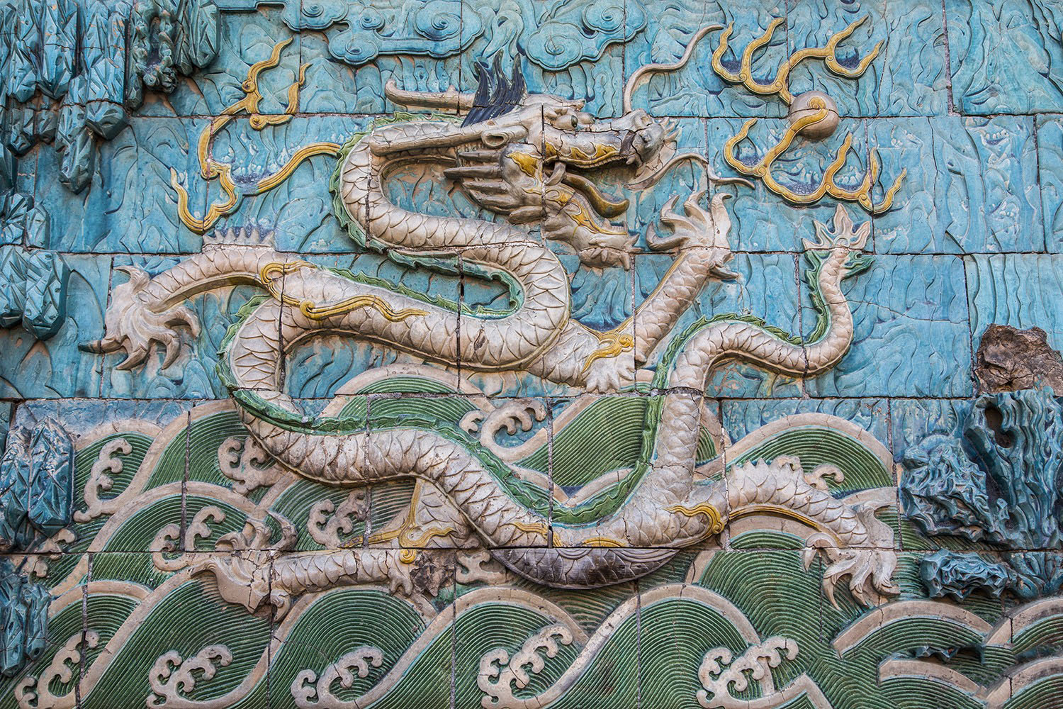 黄色正龙居中,前爪作环抱状,后爪分撅海水,龙身环曲,将火焰宝珠托于头下,瞠目张颔,威风凛然。左右两侧各有蓝白两龙,白为升龙,蓝为降龙。左侧两龙龙首相向;右侧两龙背道而弛,四龙各逐火焰宝珠,神动形移,似欲破壁而出。外侧双龙,一黄一紫,左端黄龙挺胸缩颈,上爪分张左右,下肢前突后伸;紫龙左爪下按,右爪上抬,龙尾前甩。二龙动感十足,争夺之势活灵活现。右端黄龙弓身弩背,张弛有度,腾挪跳跃之体态刻画生动;紫龙昂首收腹,前爪击浪,风姿雄健,它十分充分的显示出古代中国劳动人民的智慧和艺术才华。阳数之中,九是极数,五则居中。“九五”之制为天子之尊的重要体现。