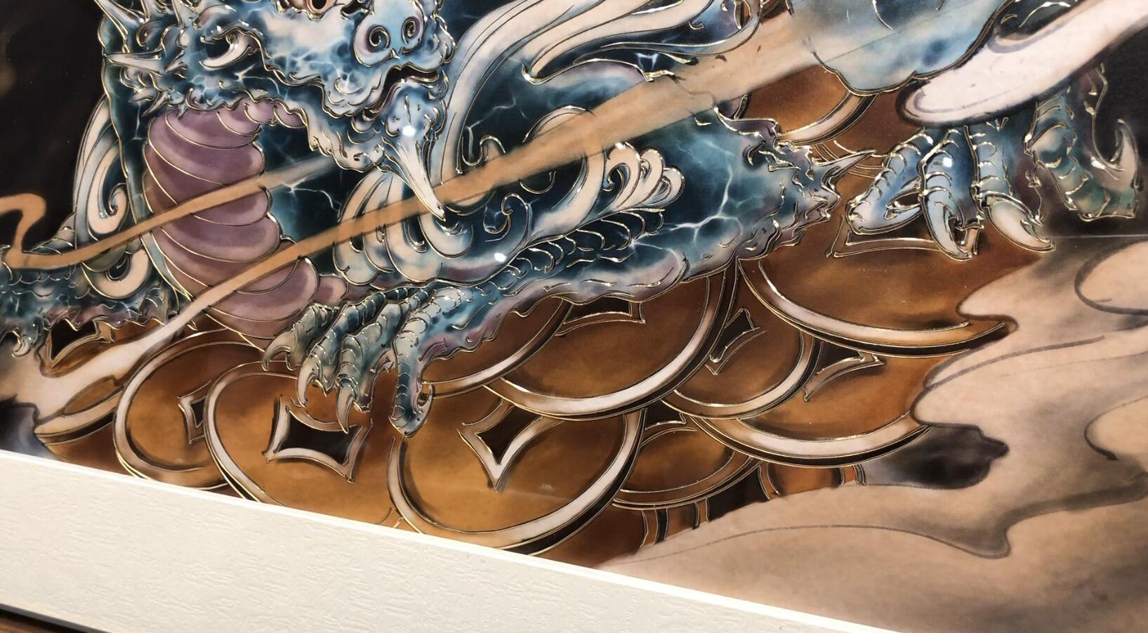 由龍专注于中华民族瑞兽造型研究这幅貔貅图画心尺寸为:136X34cm四尺对开,画框尺寸为175X50cm。画心是一整块铜板,采用錾刻的方法将貔貅图的主线条錾刻出来,由于金属錾刻痕迹的反光,整幅作品金光闪闪,实物比照片还要好看的多。此幅作品是由龍与铜雕名企业联手制作而成,将传统的国画装裱形式和现代的铜雕刻工艺结合,再加上现代感的貔貅造型和色彩布置,呈现出来的结果确实很nice......