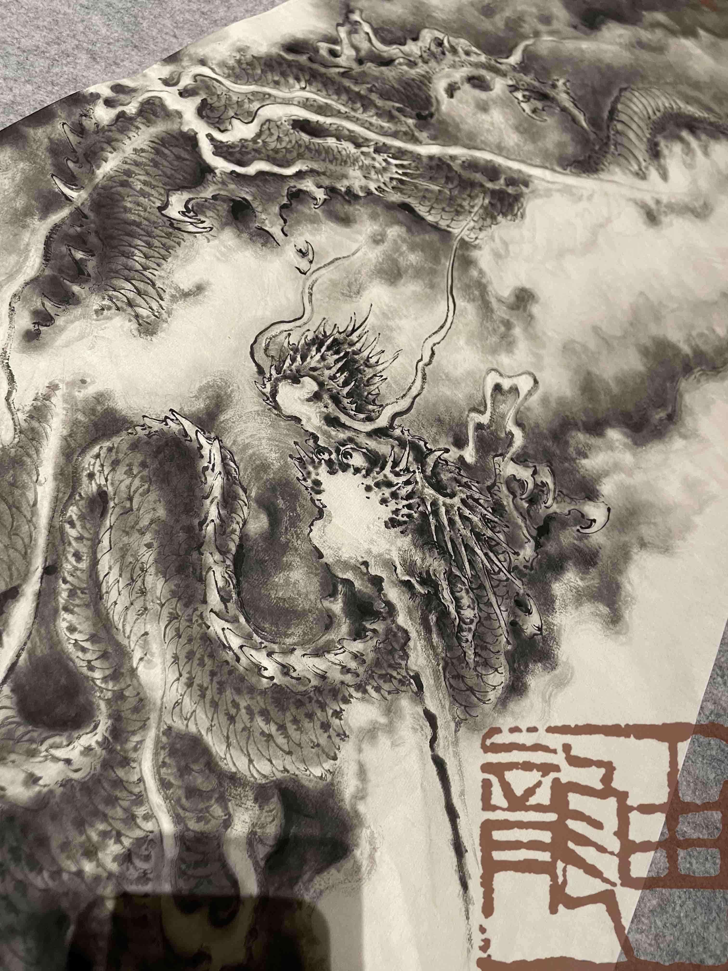 由龍专注于中华民族龍纹研究时值辛丑仲秋多雨又台风频频疫情不断,南方的气候潮湿以至于书架中的书也都长了霉,可以想象住在小桥流水旁的人家家中之书估计会霉得更加厉害。由龍绘制此云龙图于沪上恒堂小舍。此图为台湾藏家定制尺寸120x40cm(国画龙)